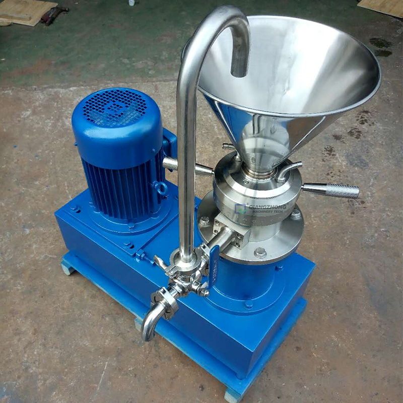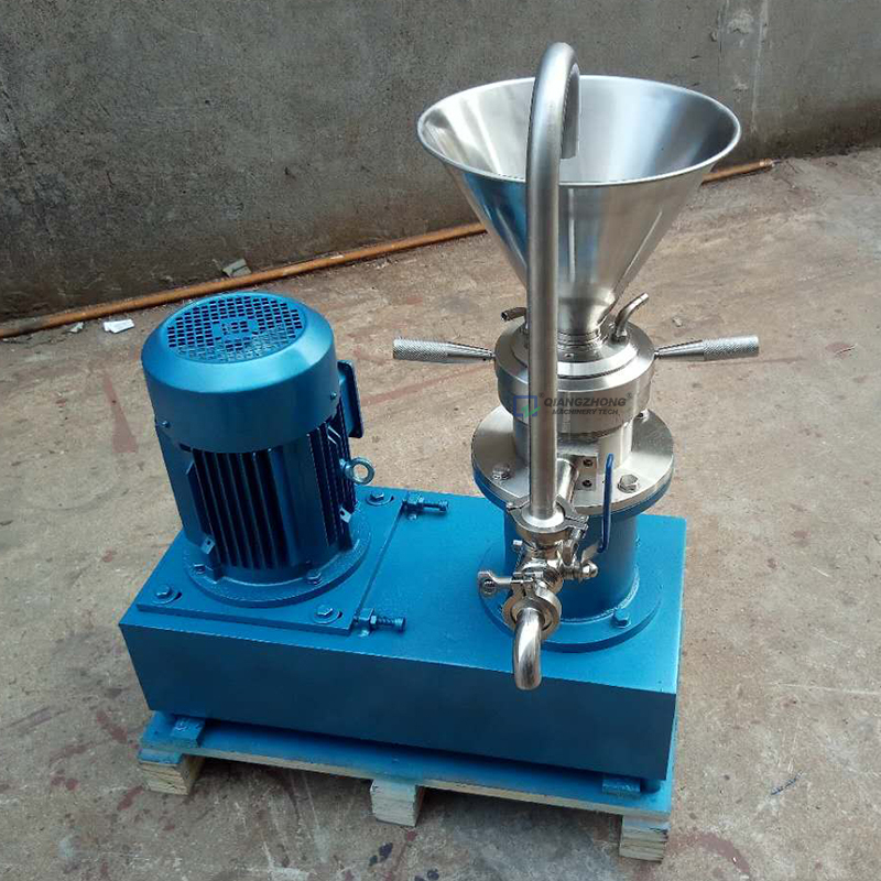 膠體磨的基本原理是流體或半流體物料通過高速相對連動的定齒與動齒之間,使物料受到強大的剪切力,磨擦力及高頻振動等作用。磨碎依靠磨盤齒形斜面的相對運動而成,其中一個高速旋轉,另一個靜止使物料通過齒斜面之間的物料受到極大的剪切力和摩擦力,同時又在高頻震動和高速漩渦等復雜力的作用下使有效地被粉碎、乳化、均質、溫合,從而獲得滿意的精細加工的產品。
