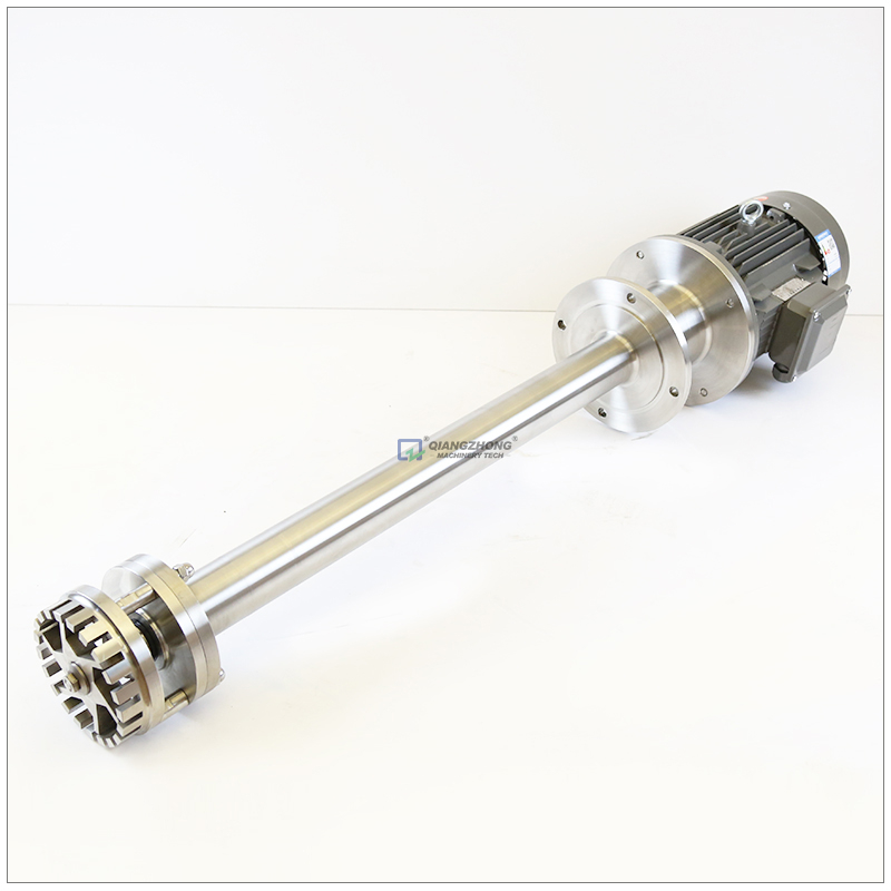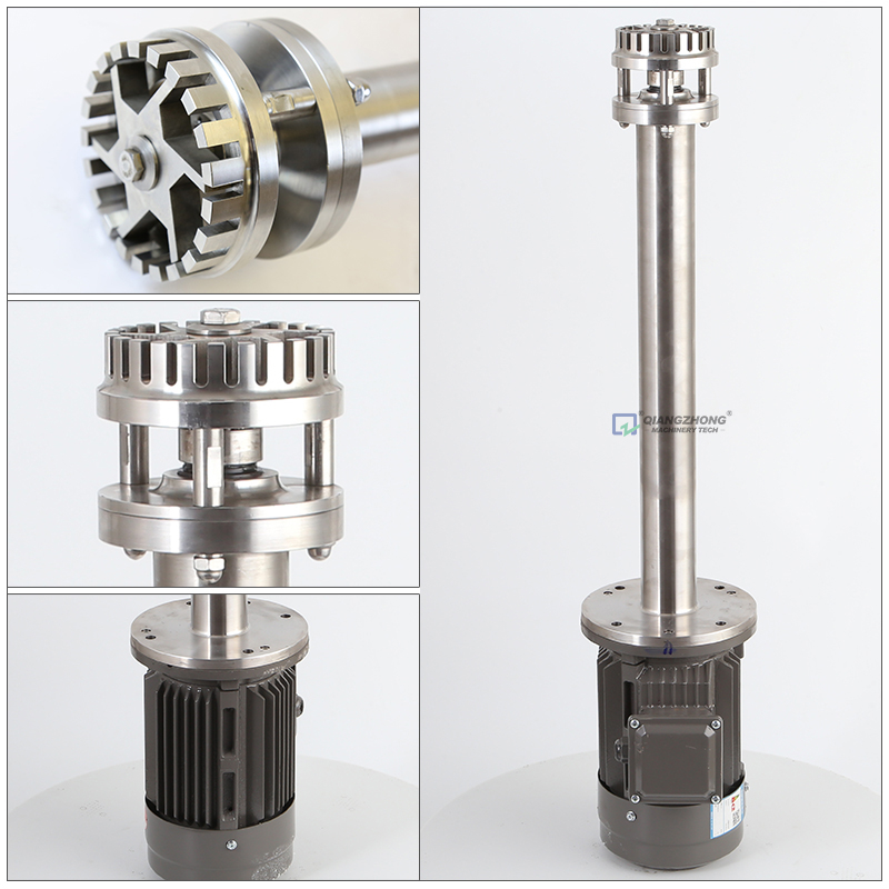 剪切機頭采用爪式、雙向吸料結構,避免了上部物料難以吸入而造成的死角和漩渦現象,高速旋轉的轉子產生強勁的剪切力,使剪切率更高,剪切力更強。在轉子產生的離心力作用下,將物料從徑向甩入定、 轉子之間狹窄精密的間隙中,同時受到離心擠壓、撞擊等作用力,使物料得到充分分散、混合、乳化。