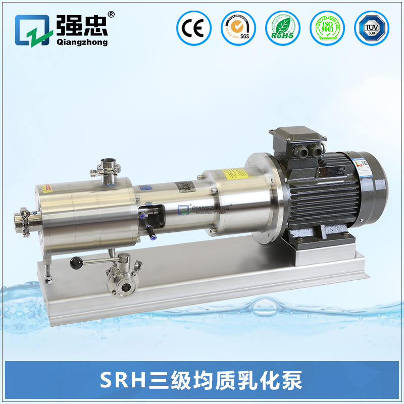 均質乳化泵/管線式高剪切分散乳化機是高效、快速、均勻地將一個相或多個相分布到另一個連續相中,而在通常情況下各個相是互不相溶的。由于轉子高速旋轉所產生的高切線速度和高頻機械效應帶來的強勁動能,使物料在定、轉子狹窄的間隙中受到強烈的機械及液力剪切、離心擠壓、液層摩擦、撞擊撕裂和湍流等綜合作用,從而使不相溶的固相、液相、氣相在相應成熟工藝和適量添加劑的共同作用下,瞬間均勻精細的分散乳化,經過高頻的循環往復,最終得到穩定的高品質產品。