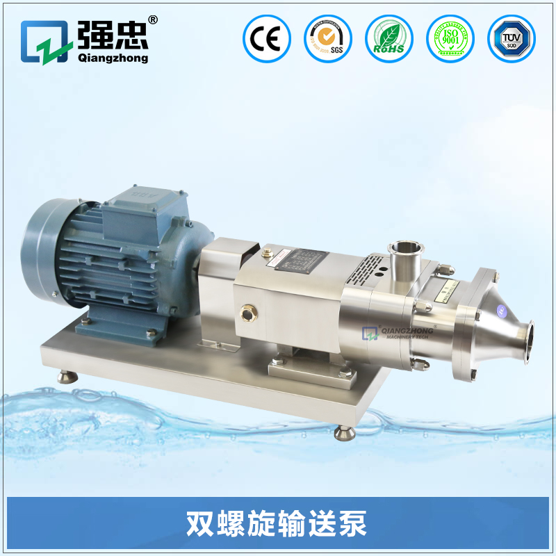 雙螺旋輸送泵采用開放式、模塊化的衛生結構,整個系統由泵體,傳動齒輪箱,電機三個主要部分組成。所有和物料接觸的部分都采用高等級優質304/316L不銹鋼,傳動部分也采用球墨、304不銹鋼和鑄鋼三種材質,保持設備的高等級、高質量。作為整個系統核心部件的泵體,由前腔蓋、腔體、螺旋轉子、傳動軸、機封腔體、機械密封等部分組成。傳動軸采用粗壯加強型設計,通體一體化結構,選用優質的、高強度的特殊沉淀不銹鋼材料,經過固熔和硬化處理。